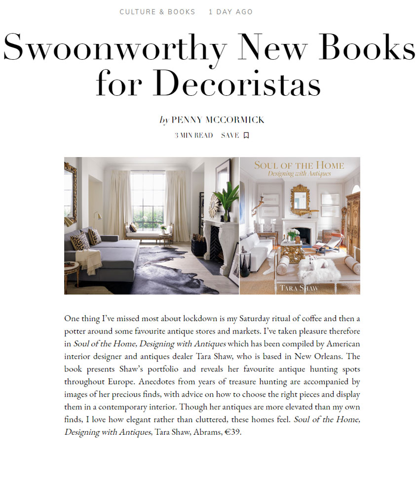 One thing I’ve missed most about lockdown is my Saturday ritual of coffee and then a potter around some favourite antique stores and markets. I’ve taken pleasure therefore in Soul of the Home, Designing with Antiques which has been compiled by American interior designer and antiques dealer Tara Shaw, who is based in New Orleans. The book presents Shaw’s portfolio and reveals her favourite antique hunting spots throughout Europe. Anecdotes from years of treasure hunting are accompanied by images of her precious finds, with advice on how to choose the right pieces and display them in a contemporary interior. Though her antiques are more elevated than my own finds, I love how elegant rather than cluttered, these homes feel. Soul of the Home, Designing with Antiques, Tara Shaw, Abrams, €39.