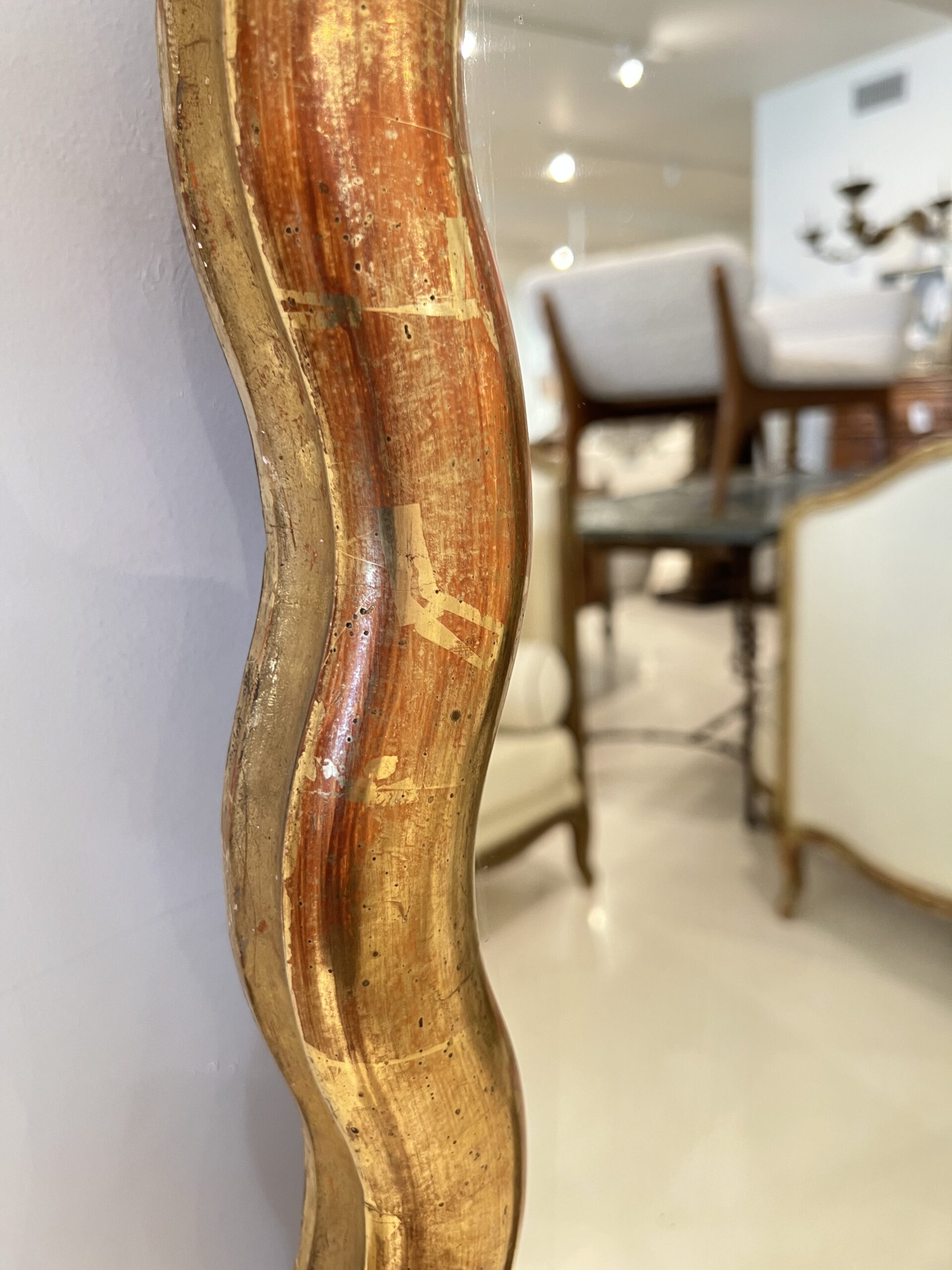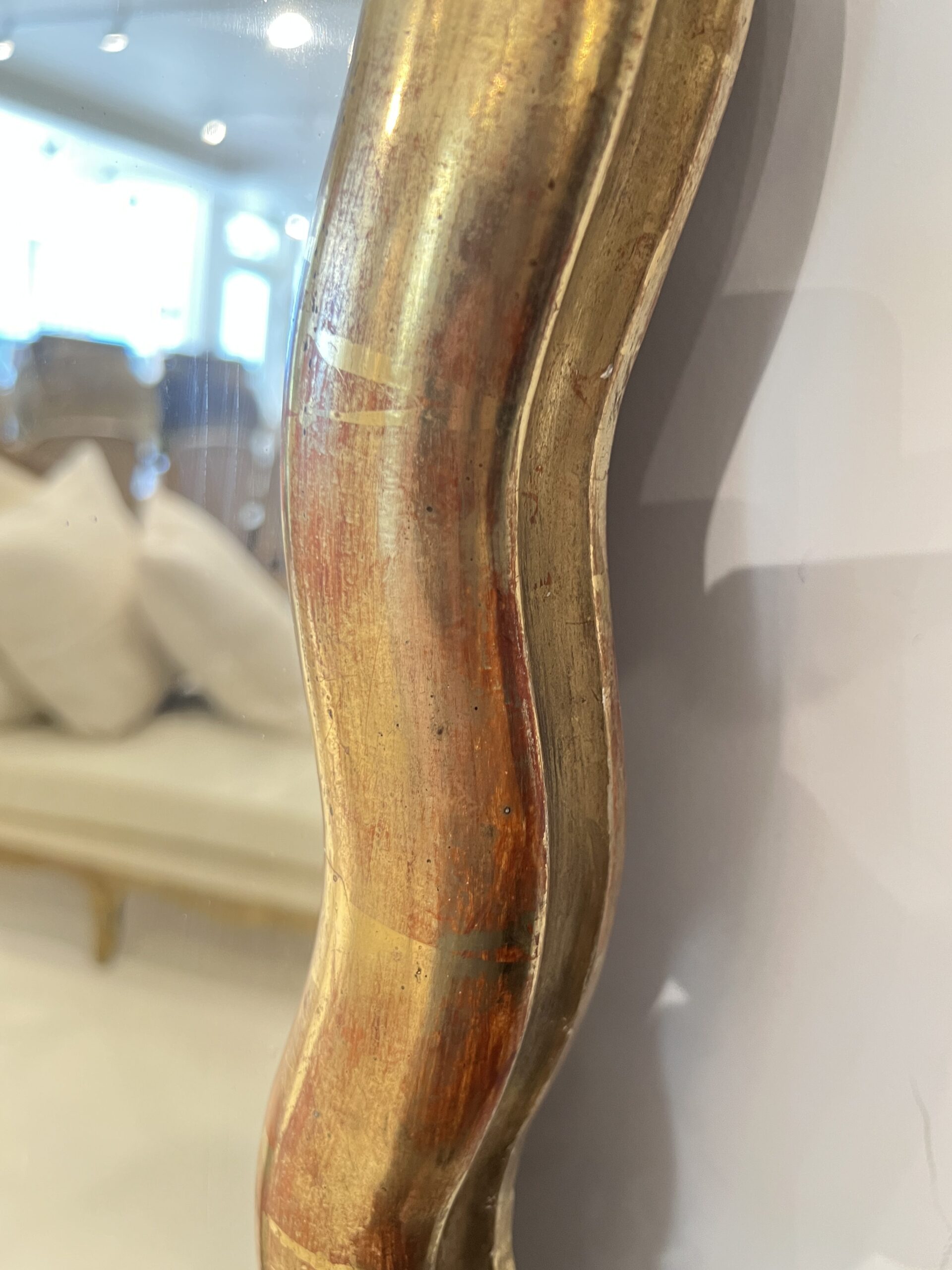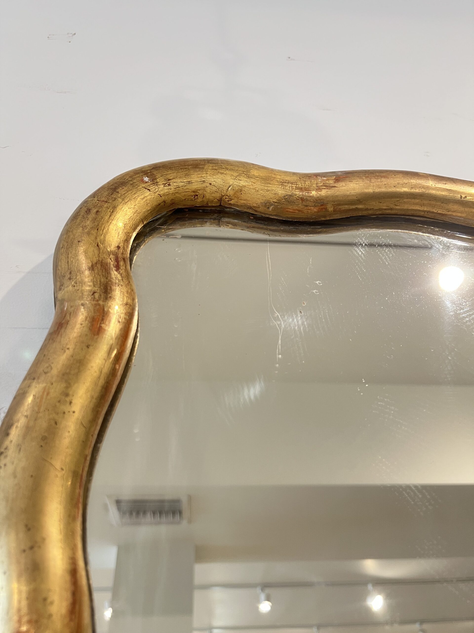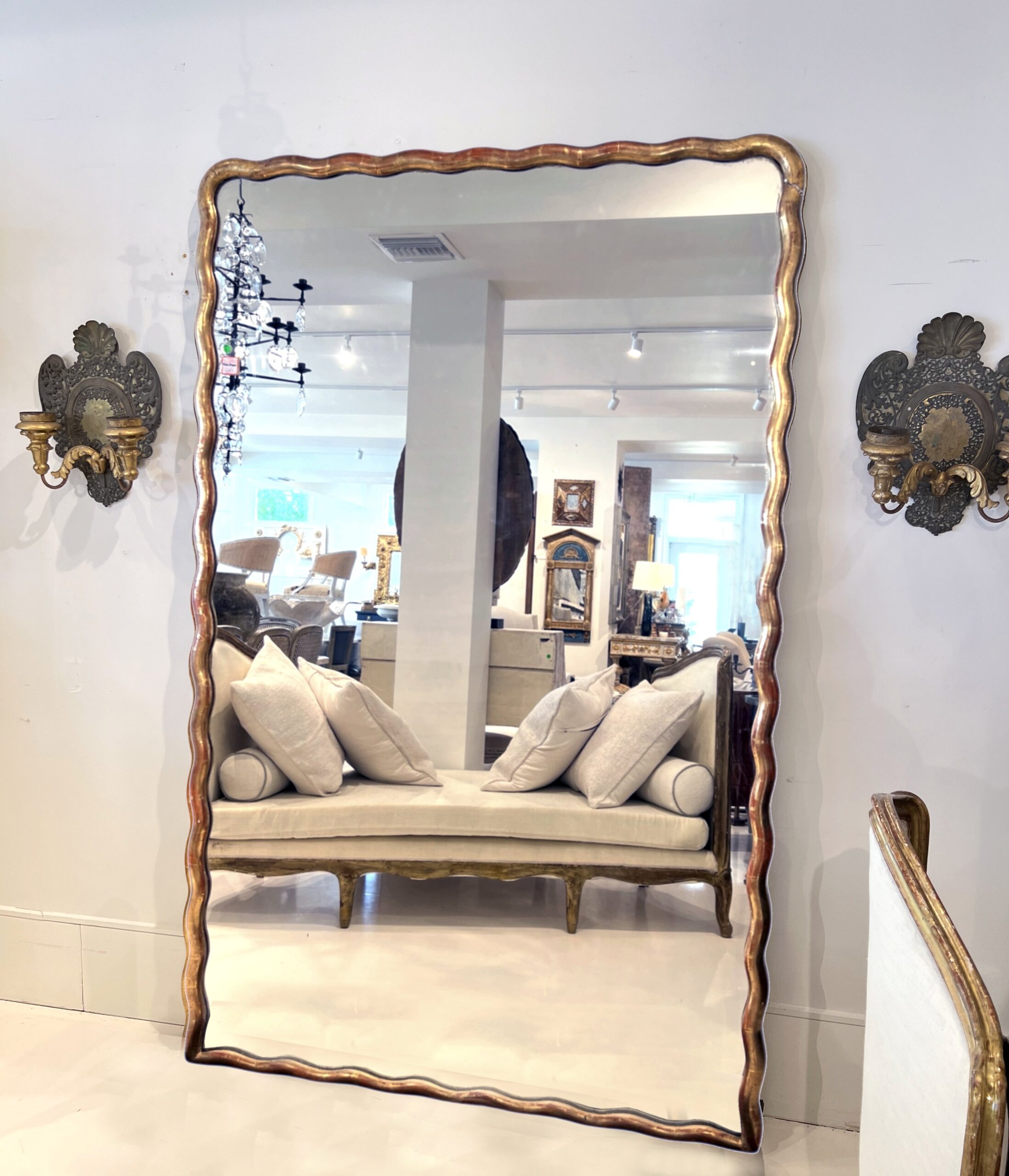 A striking large French Directoire mirror with a scalloped gilded frame, combining neoclassical symmetry with subtle curves—offering understated elegance and a luminous focal point.