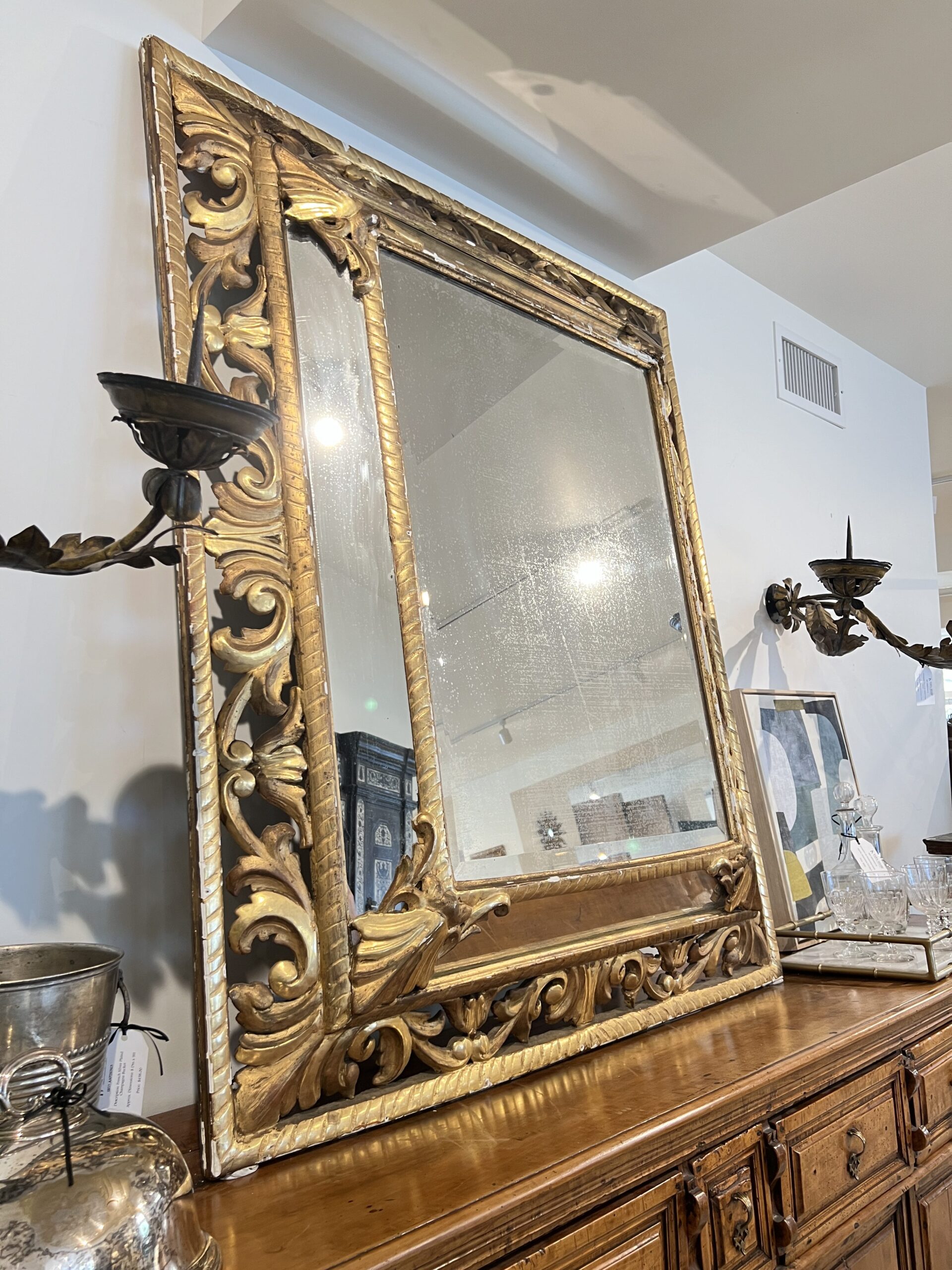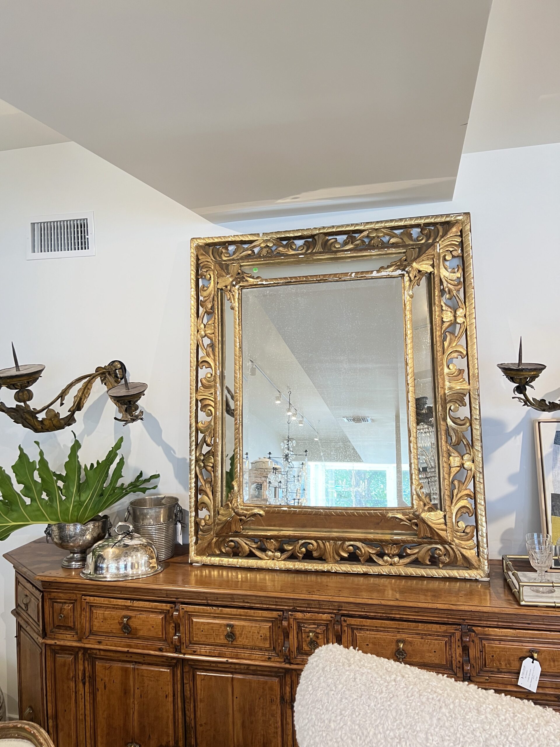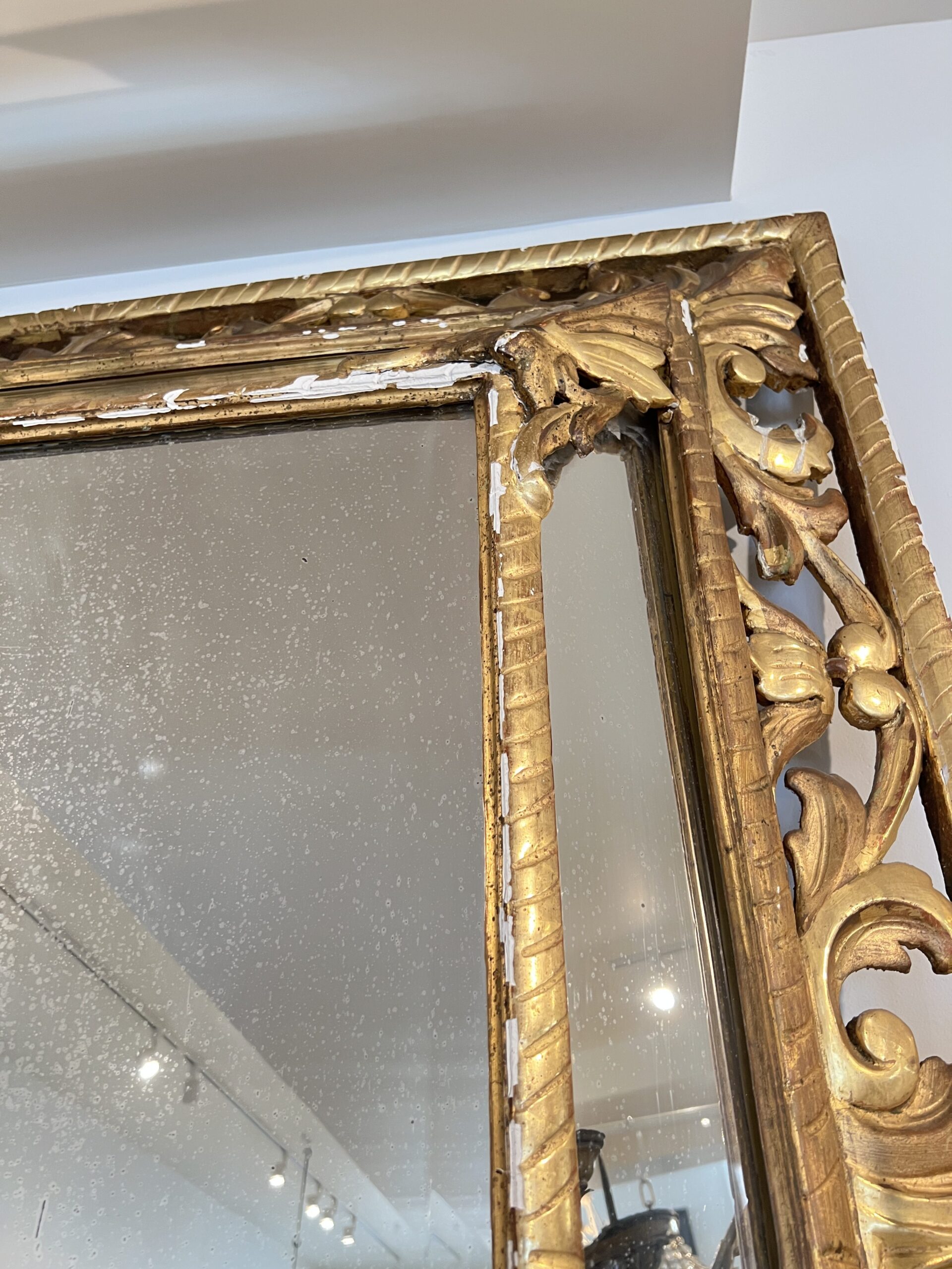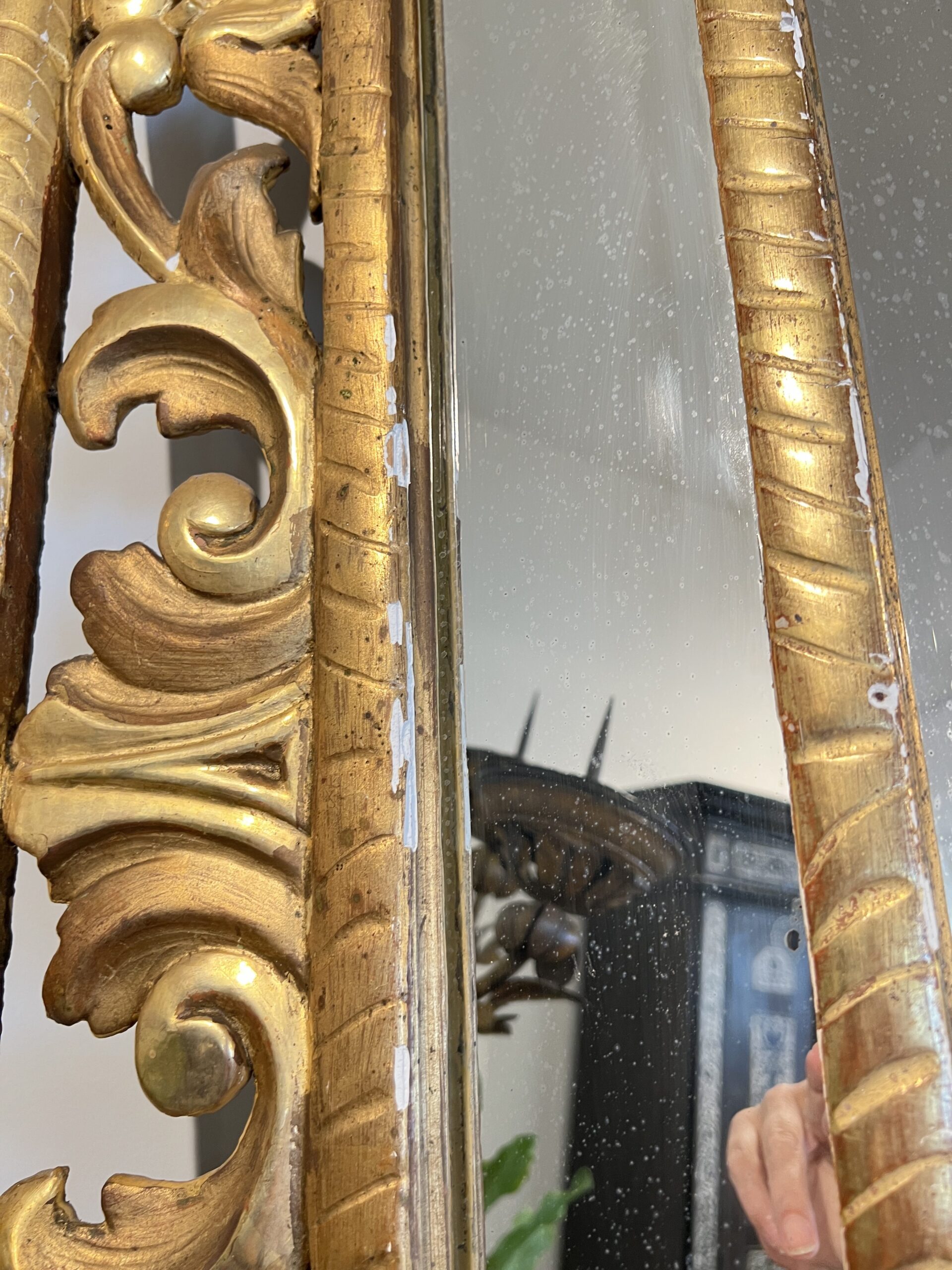 An elegant Louis XVI gilded antique mirror featuring a richly carved frame with neoclassical motifs and a wide, beveled glass border—offering timeless symmetry, refined ornamentation, and luminous sophistication.
