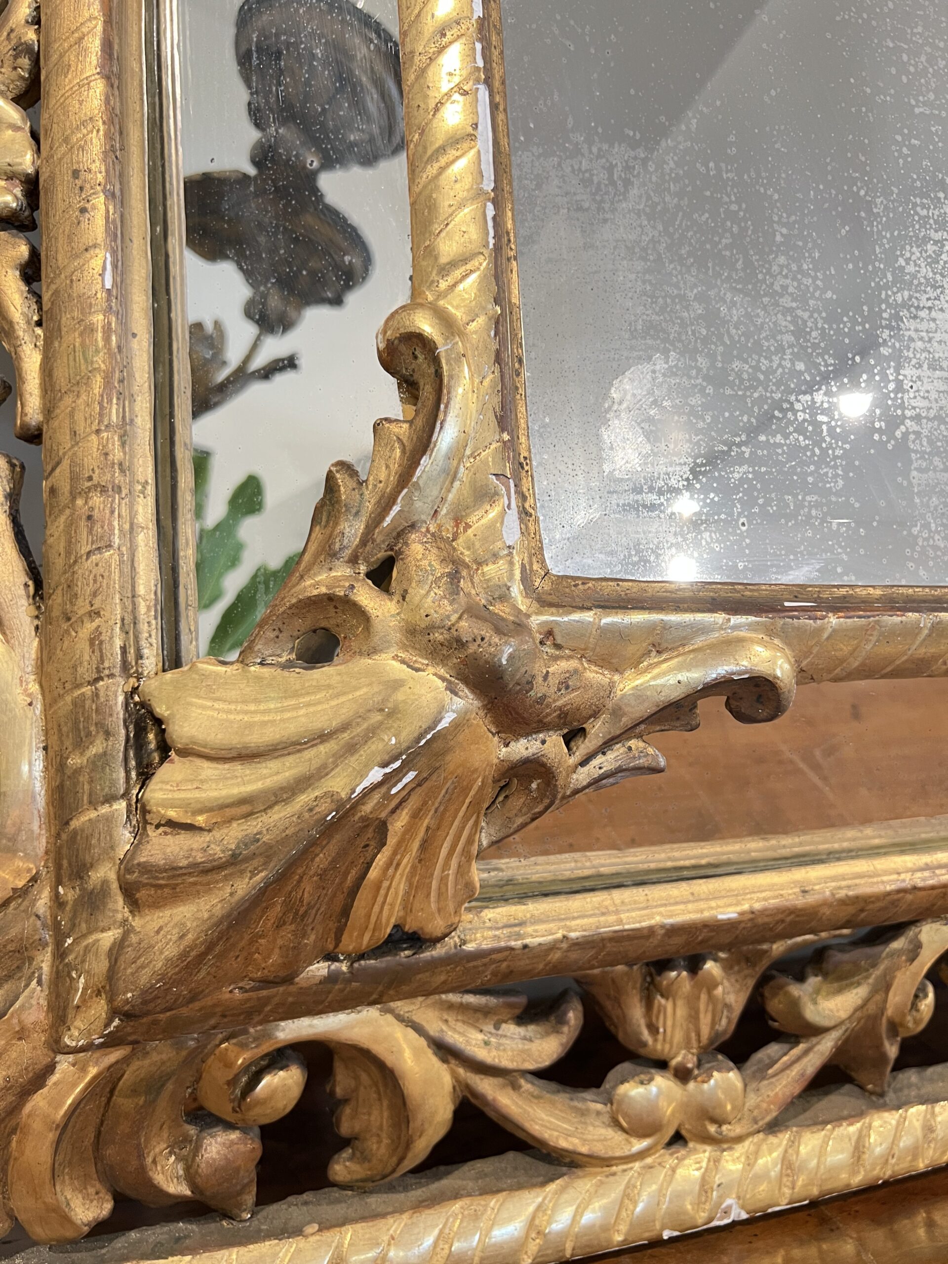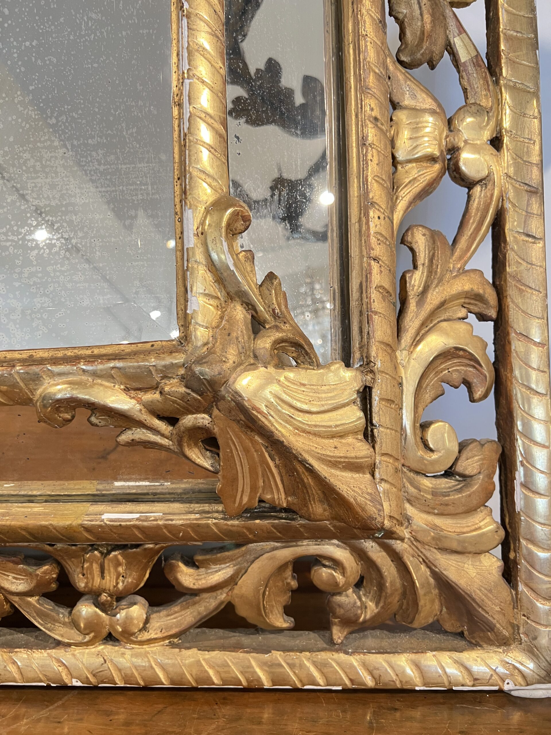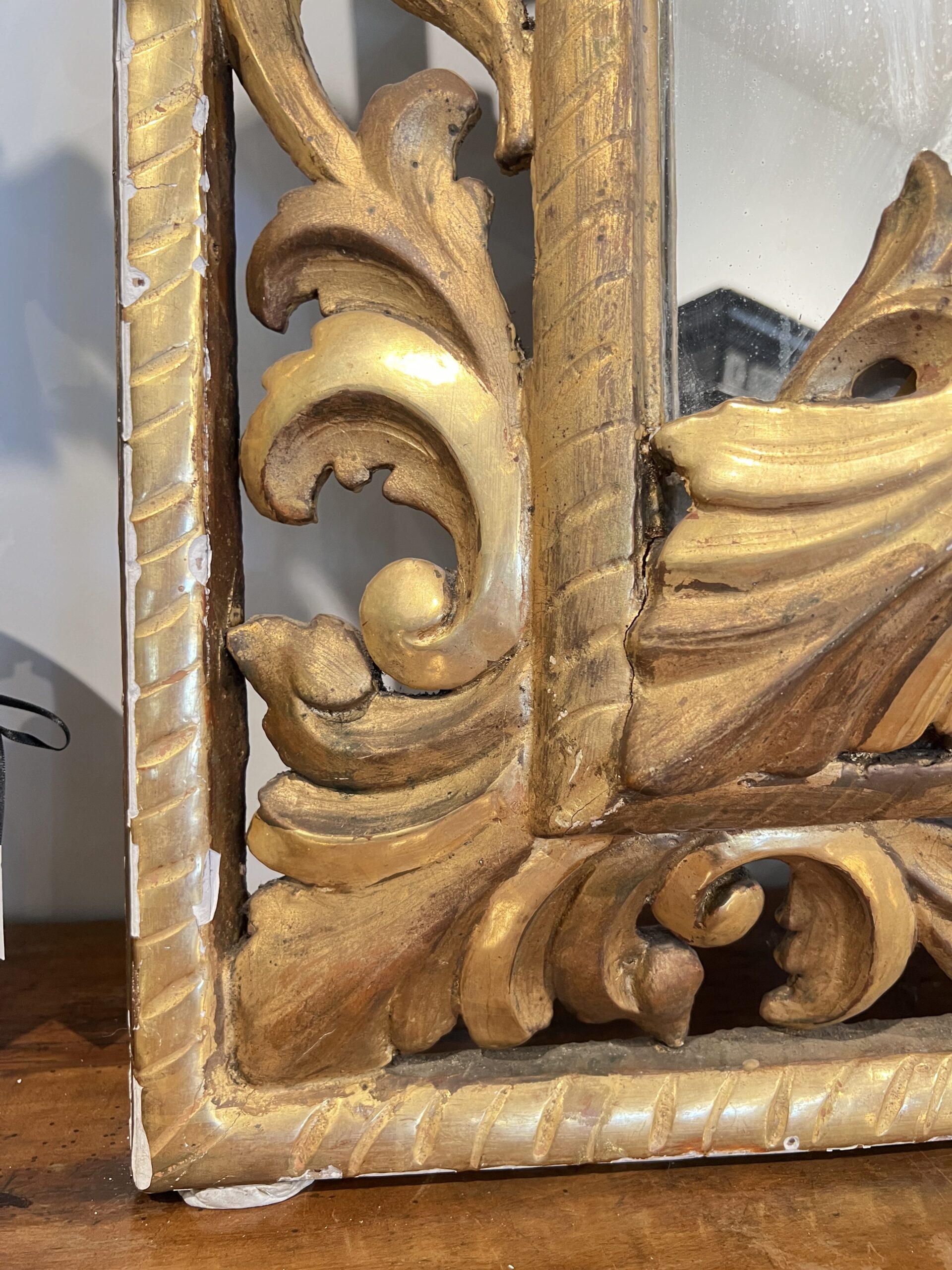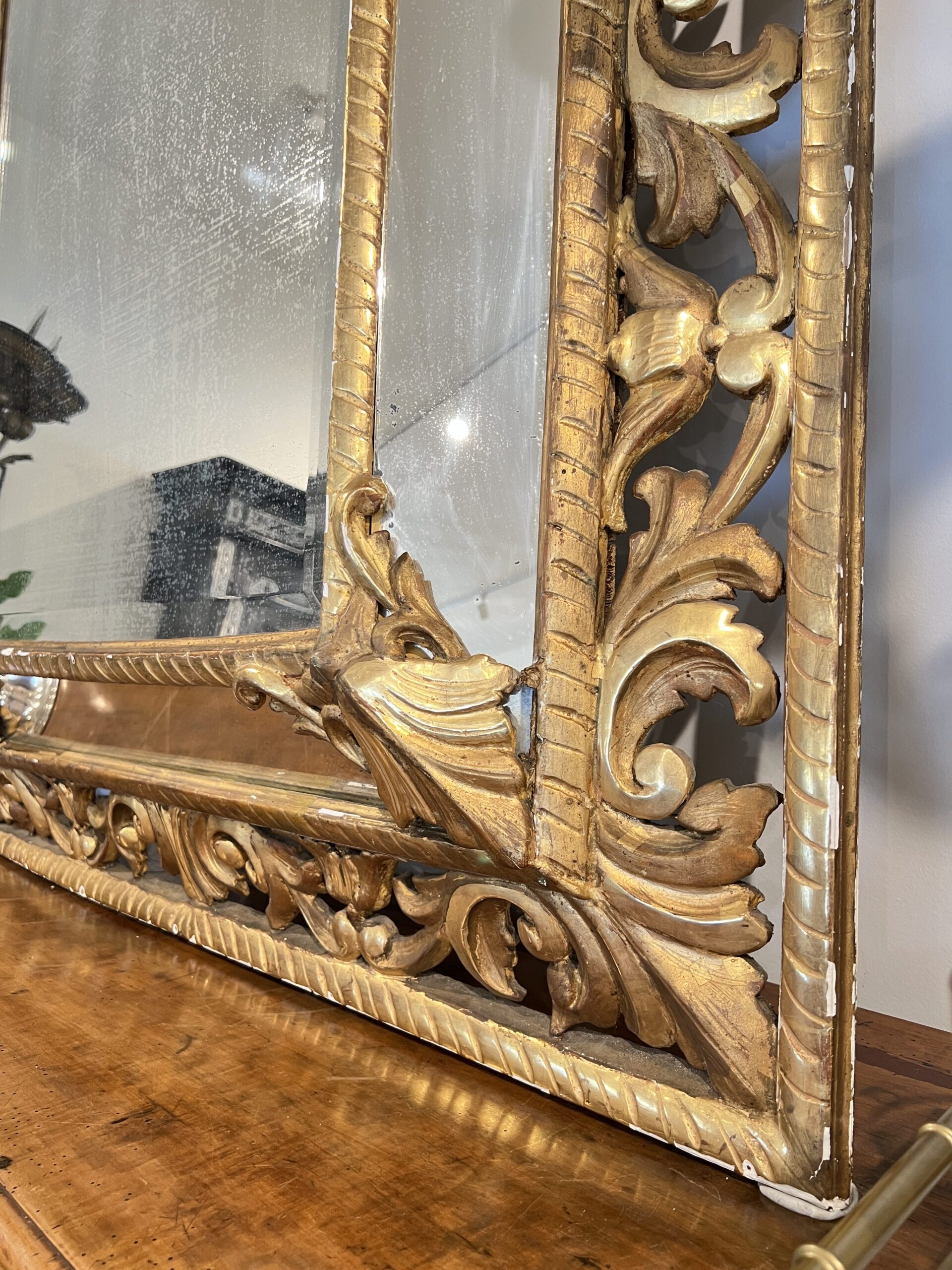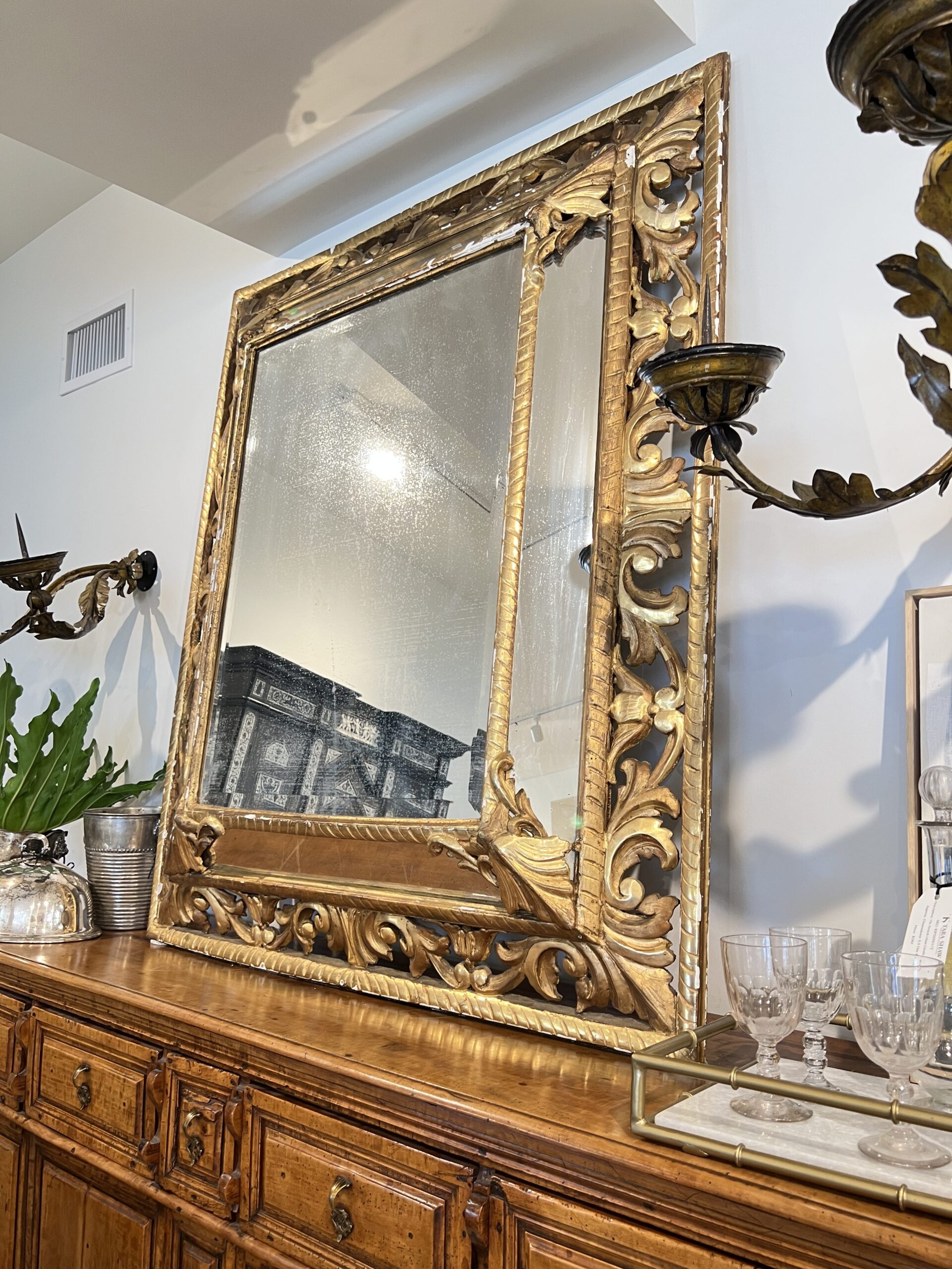 An elegant Louis XVI gilded antique mirror featuring a richly carved frame with neoclassical motifs and a wide, beveled glass border—offering timeless symmetry, refined ornamentation, and luminous sophistication.