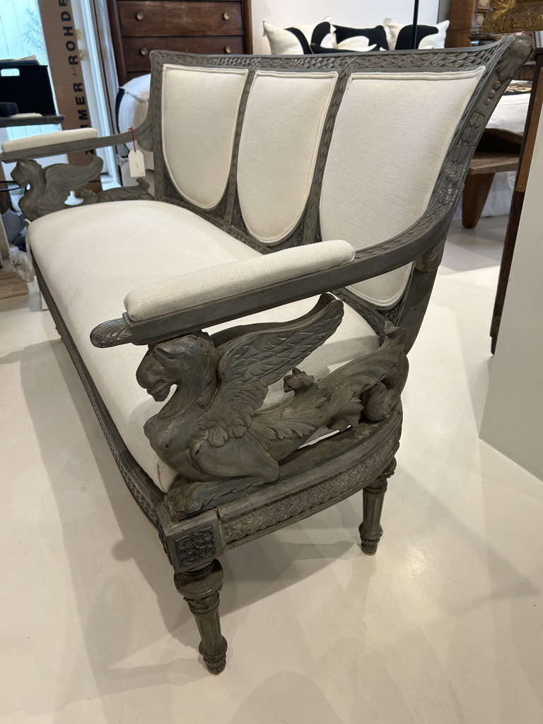 With significant size and presence, this armed bench has a long single seat and three separate upholstered back rests and upholstered arm rests. Reupholstered in linen with double cording. The elaborately carved wood is painted a dark grey. The most notable features are the large griffons facing forward under the arm rests. Viewed from the side, you can see the griffons’ full body with coiled tail. The back of the bench gently curves toward the front at the ends that gives this bench a welcoming feel. *Minor structural damages. Right arm has a crack in it and needs repairs. Up close pictures of the crack are in the photos.