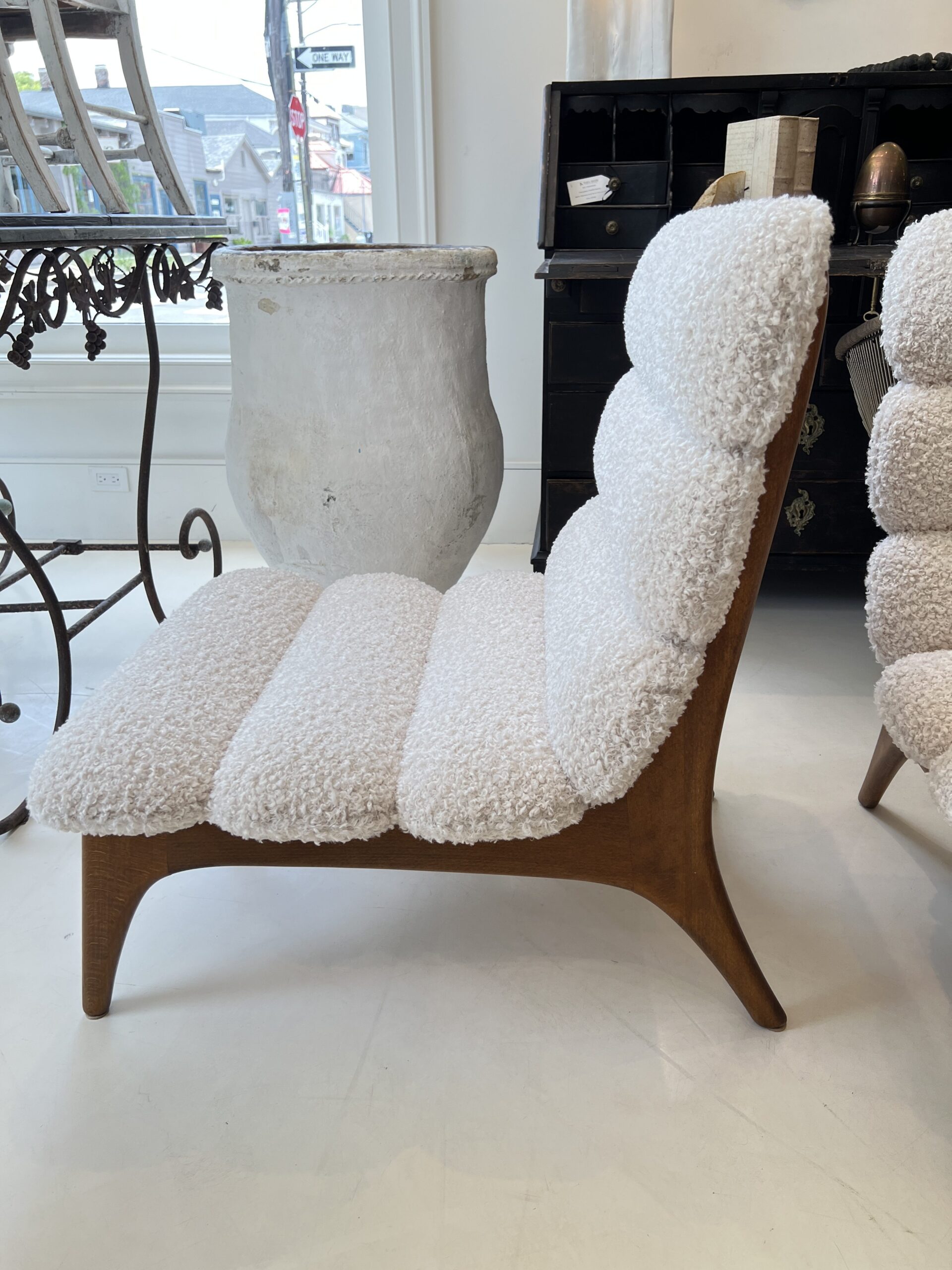 A refined pair of mid-century Italian chairs crafted in ash wood, featuring clean sculptural lines and upholstered in creamy bouclé for a warm, textural contrast that blends timeless elegance with modern comfort.