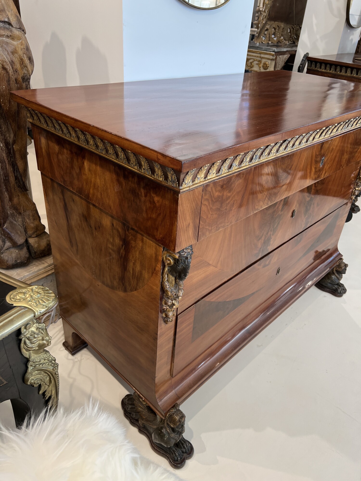 These 18th-century mahogany chests with sphinx feet and ram’s head embellishments suggest an influence from the Neoclassical period, particularly the Louis XVI style in France or the Adam style in Britain. These motifs were inspired by the renewed interest in classical antiquity, fueled by archaeological discoveries in Greece and Rome.