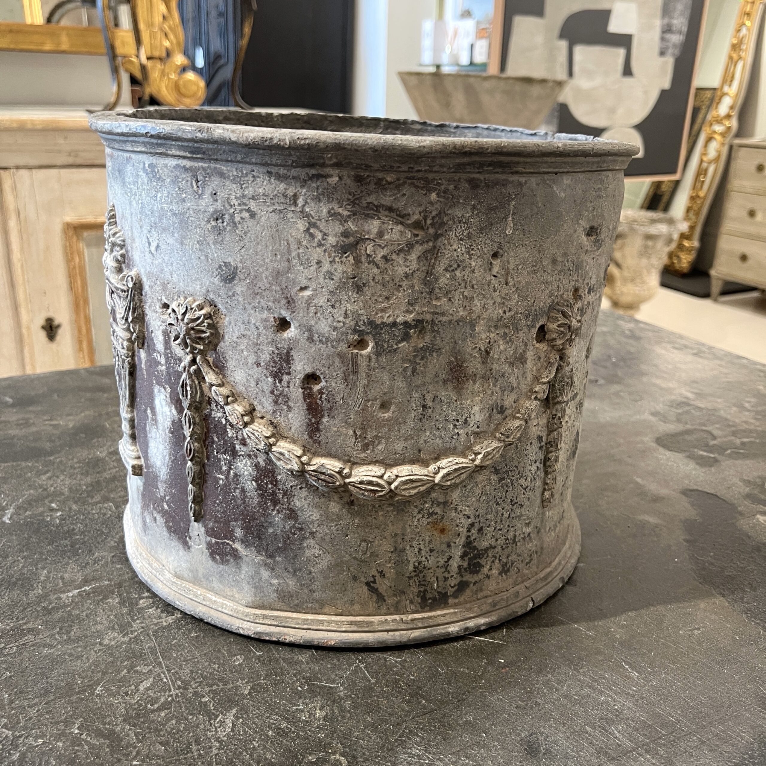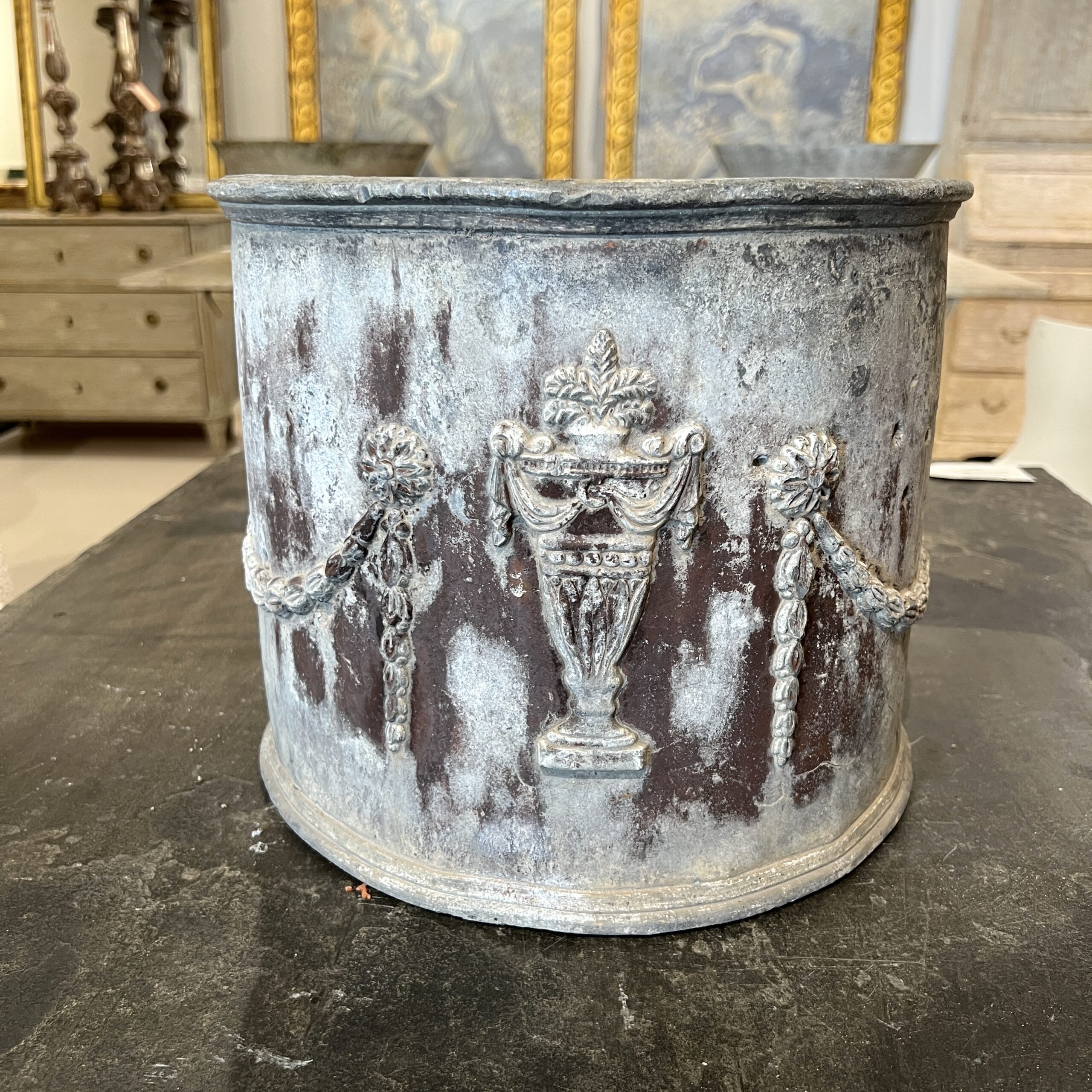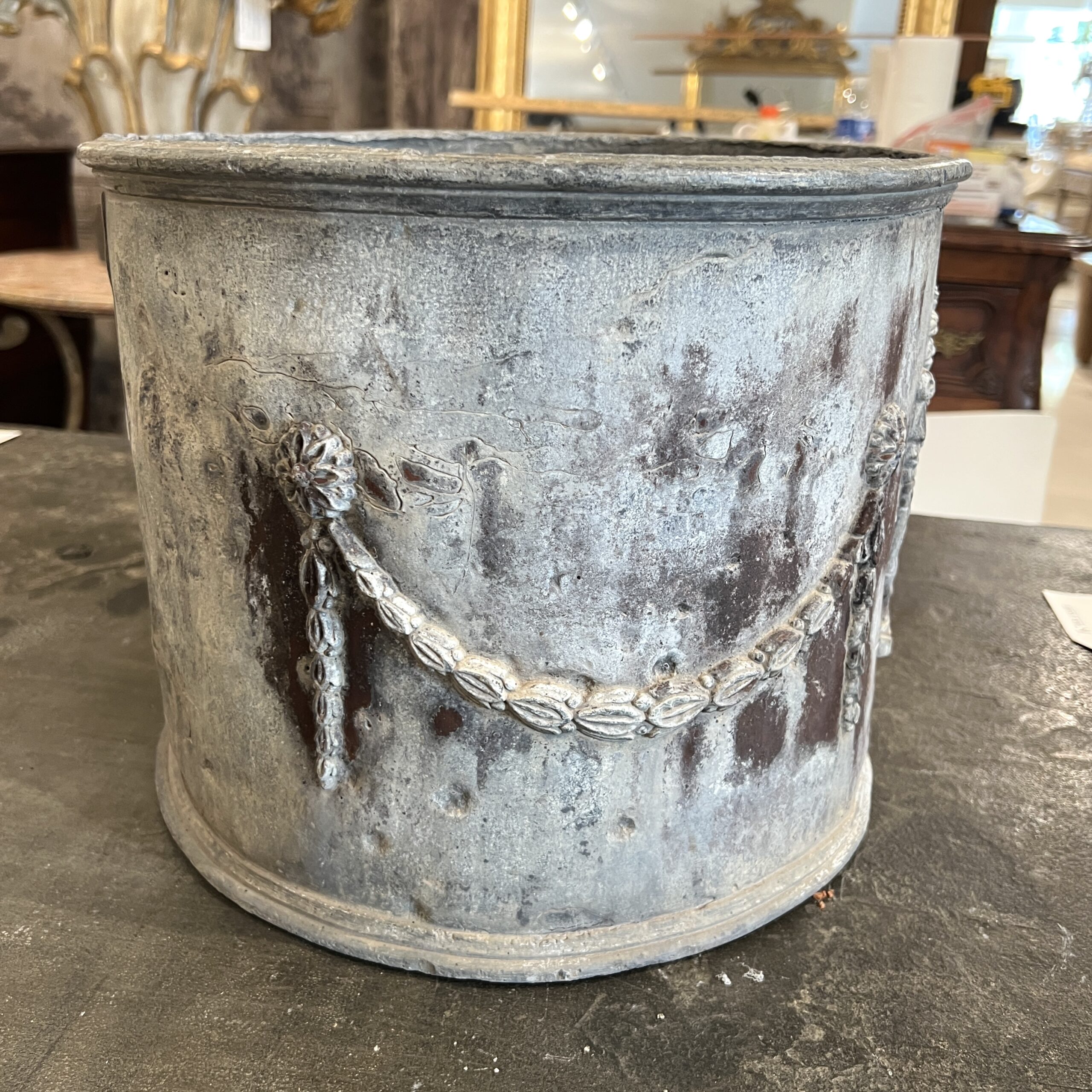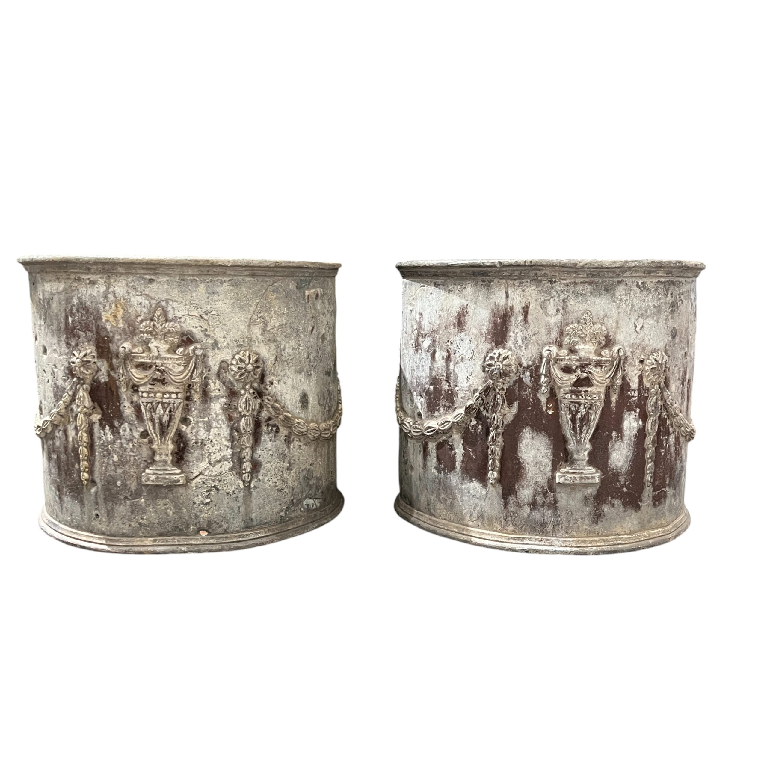 A classic pair of English lead planters adorned with elegant garland reliefs, showcasing timeless craftsmanship and weathered patina—ideal for adding a touch of stately charm to garden or terrace settings.