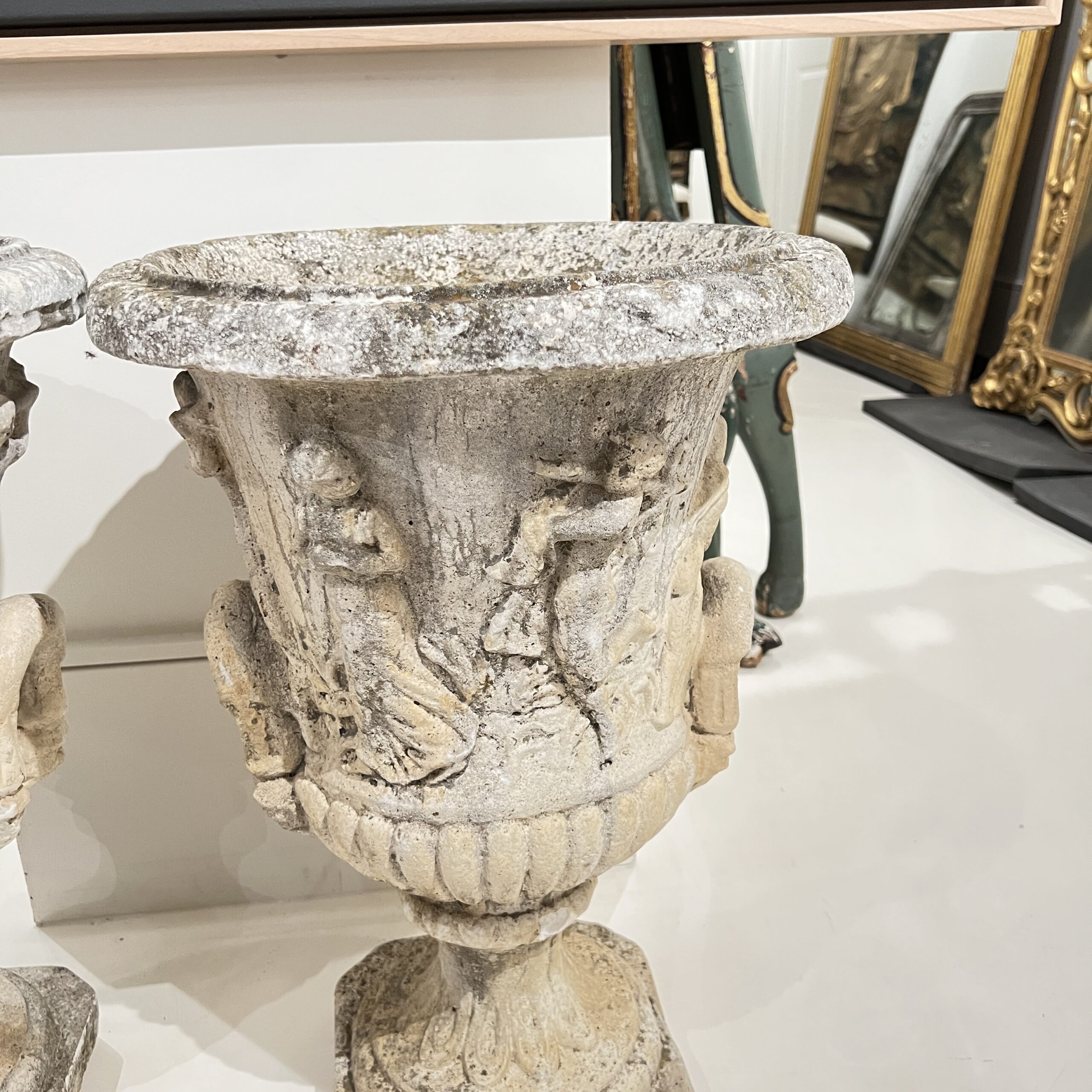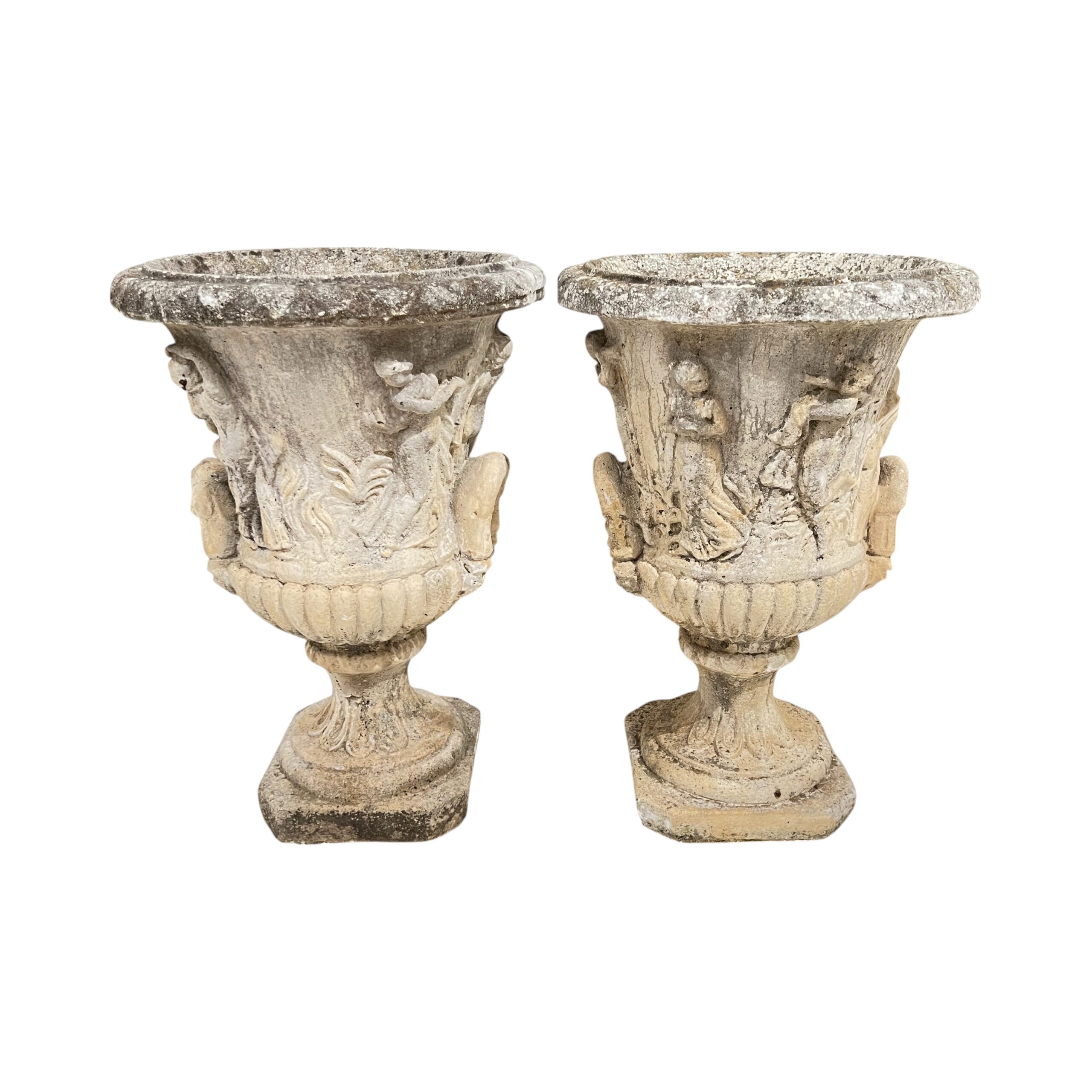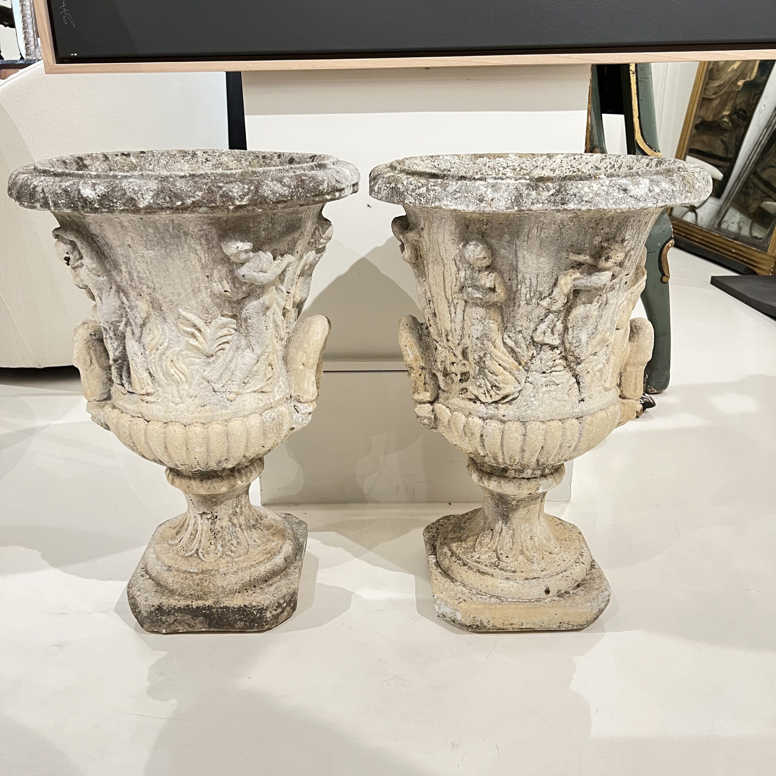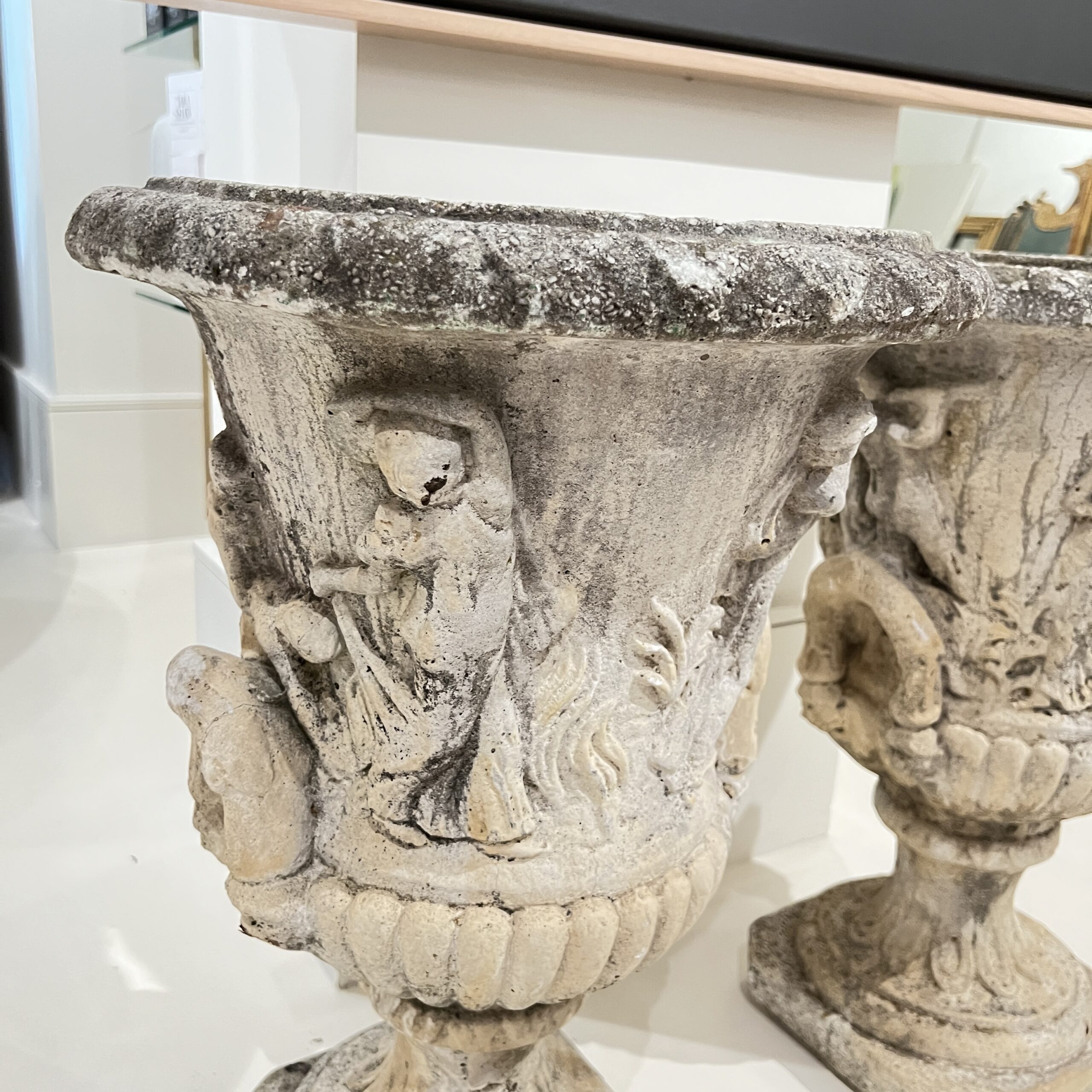 Antique French Pair of Concrete Jardinieres w/Neoclassical Reliefs