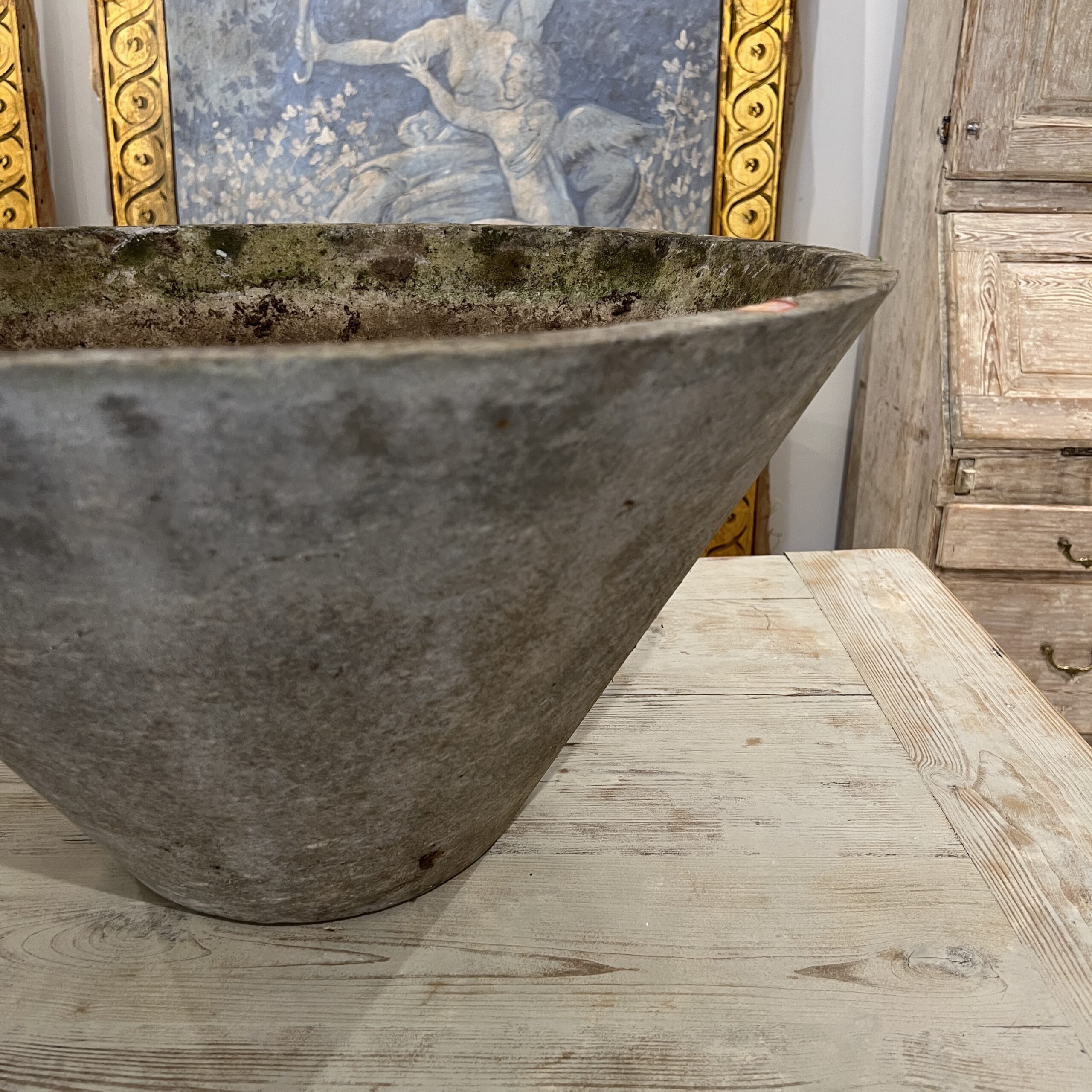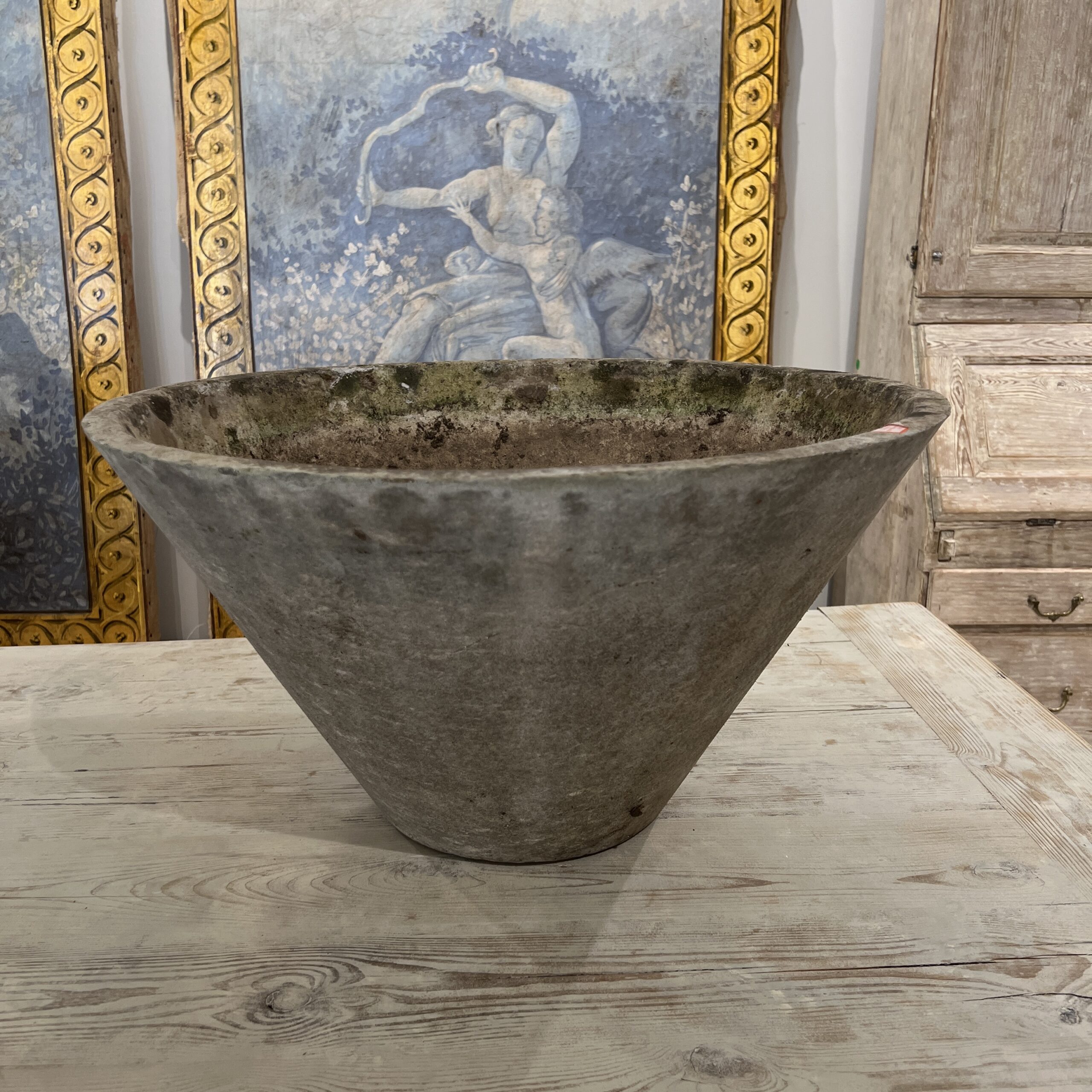 A minimalist Willy Guhl tapered planter made from durable fiber cement, featuring clean, angular lines and a subtly flared form—an enduring example of mid-century Swiss design that balances function with sculptural elegance.
