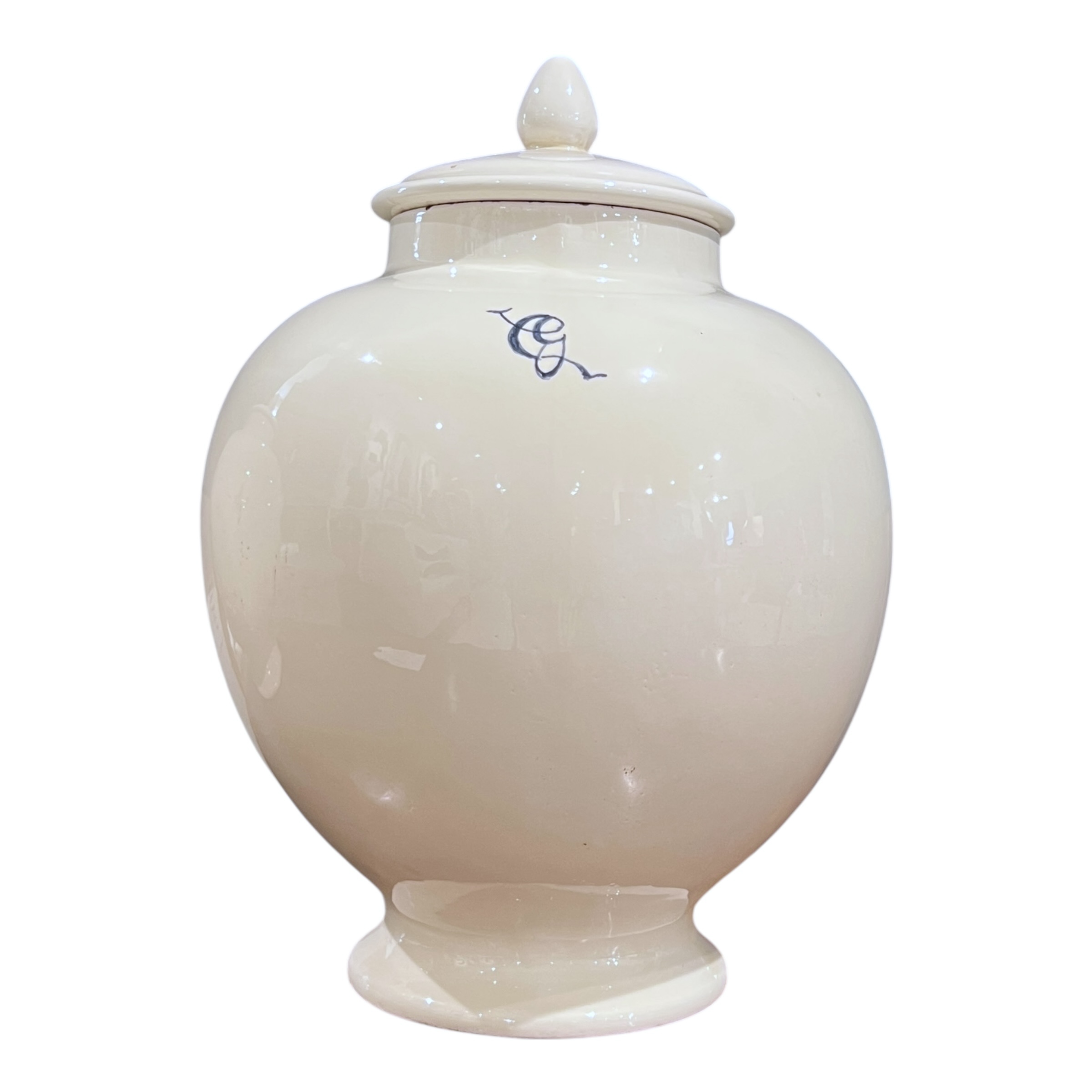 This set of four antique jars with lids features beautifully aged finishes, a curious monogram and classic silhouettes; ideal for adding character and functional charm to kitchen, bath, or shelf displays.