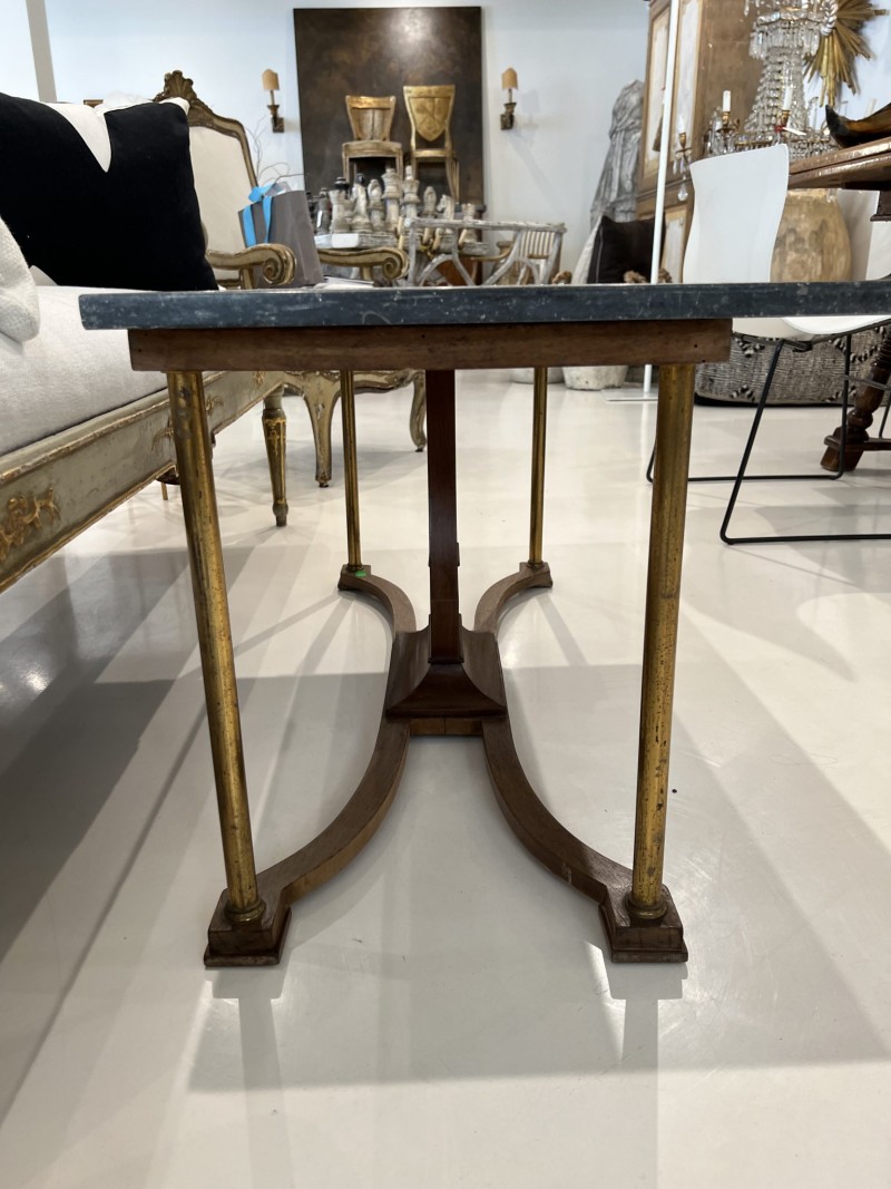 The dark marble top is supported by a lyre shaped base and brass legs. This vintage french coffee table will make a beautiful addition to any seating area.