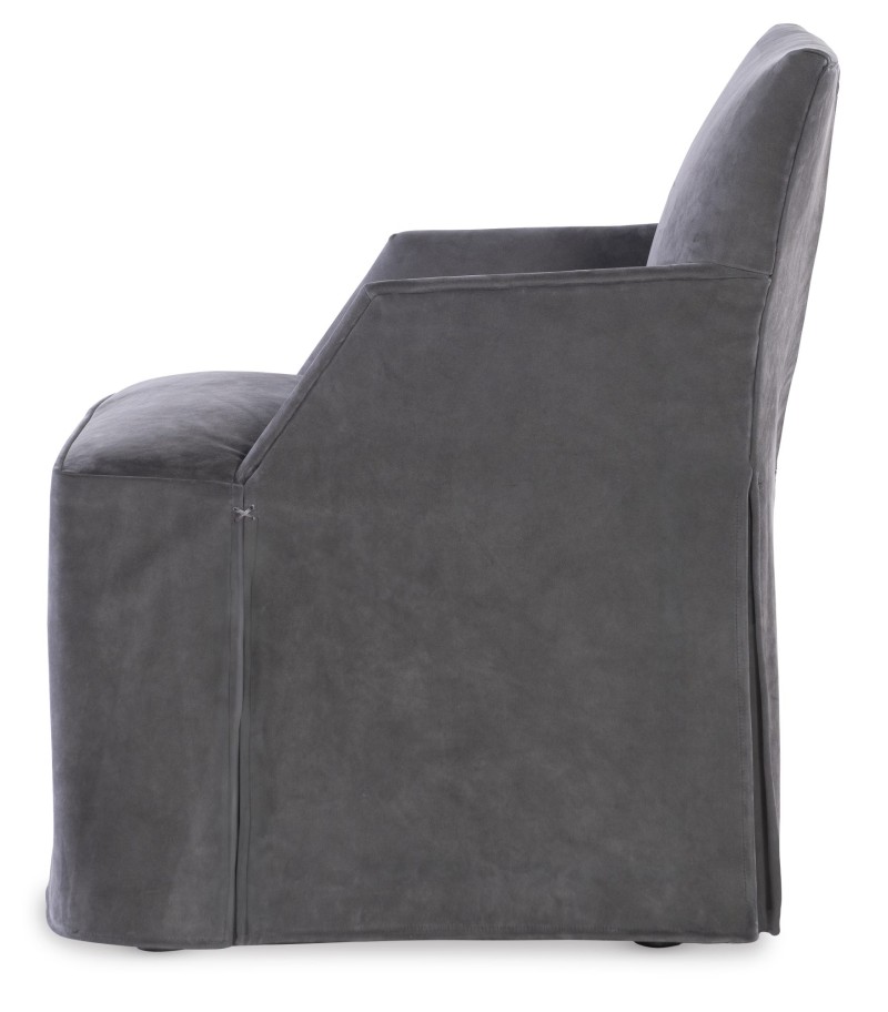 The European inspired dining or club chair, with waterfall arm and tight seat is characterized by its smooth, flowing lines and stitch detail at the pleats, reflects a modern design aesthetic that emphasizes sleek forms and subtle craftsmanship. This style draws inspiration from mid-century modern design, known for its minimalist approach and attention to detail, while incorporating contemporary elements. Available in any Century fabric or COM.